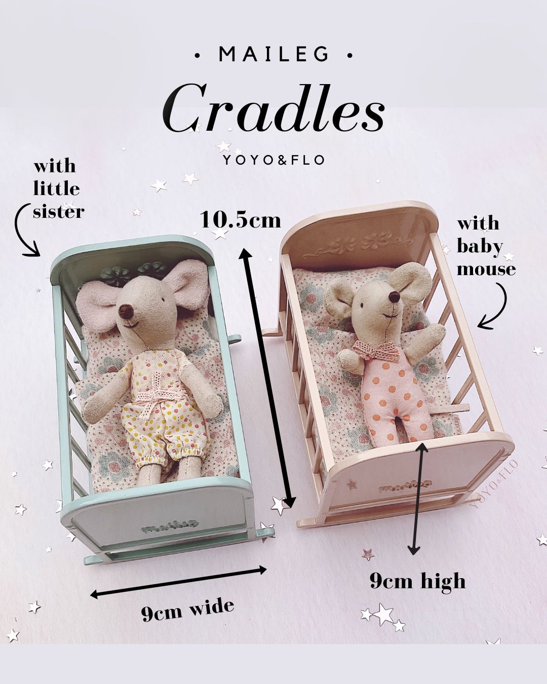 Maileg beds, cradles and cots come in many different sizes, styles and colours and we have them all at Yoyo & Flo. Whether you're looking for a double bed for mum and dad size mice, a single bed for your brother and sister mice, or a cute cradle for your baby mice, you'll find the complete collection of Maileg beds. Sweet dreams are guaranteed for your Maileg friends!