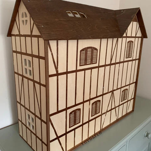 The dolls house is designed in a rustic, farmhouse style with gorgeous details, including windows, arched doorways and even an attic space with a skylight.