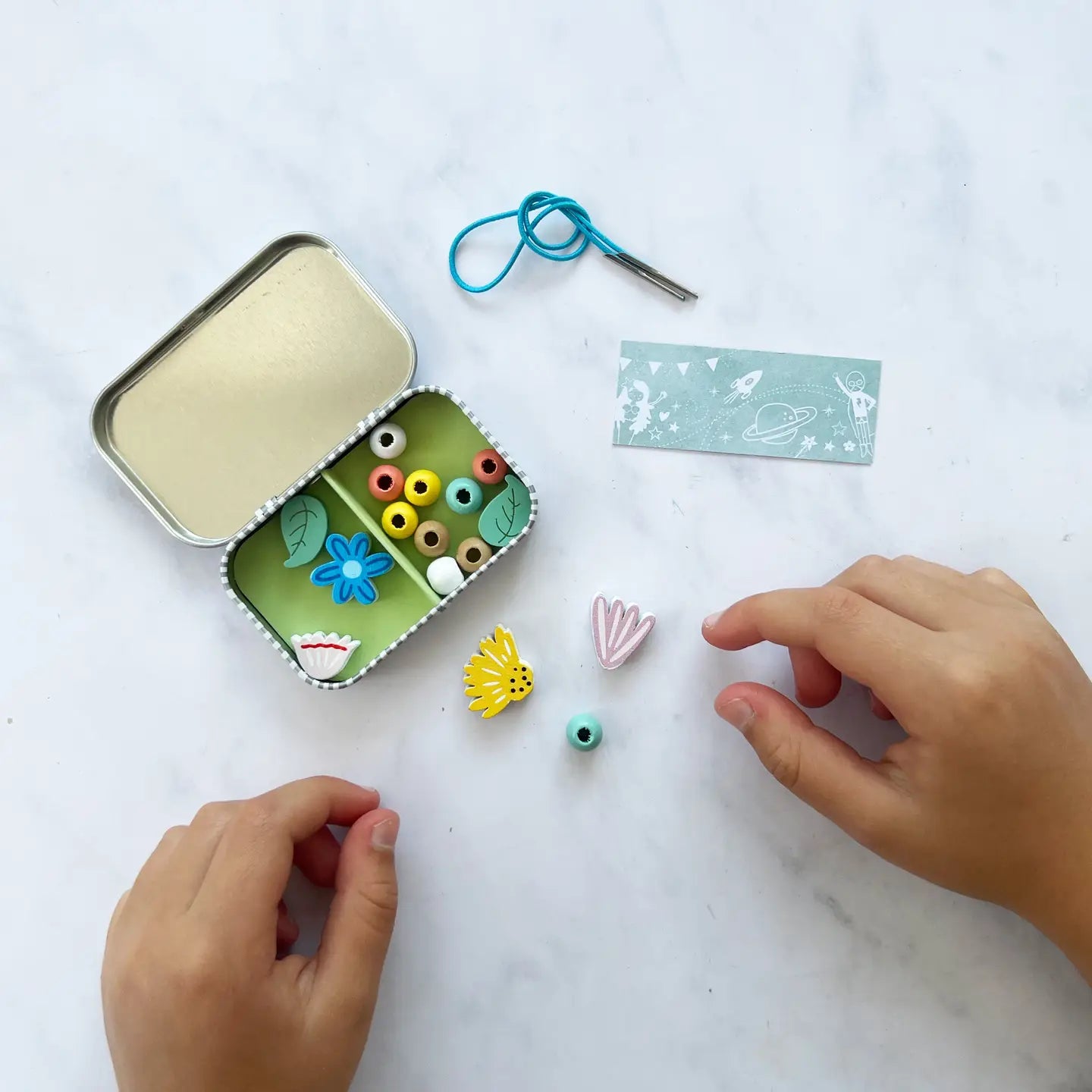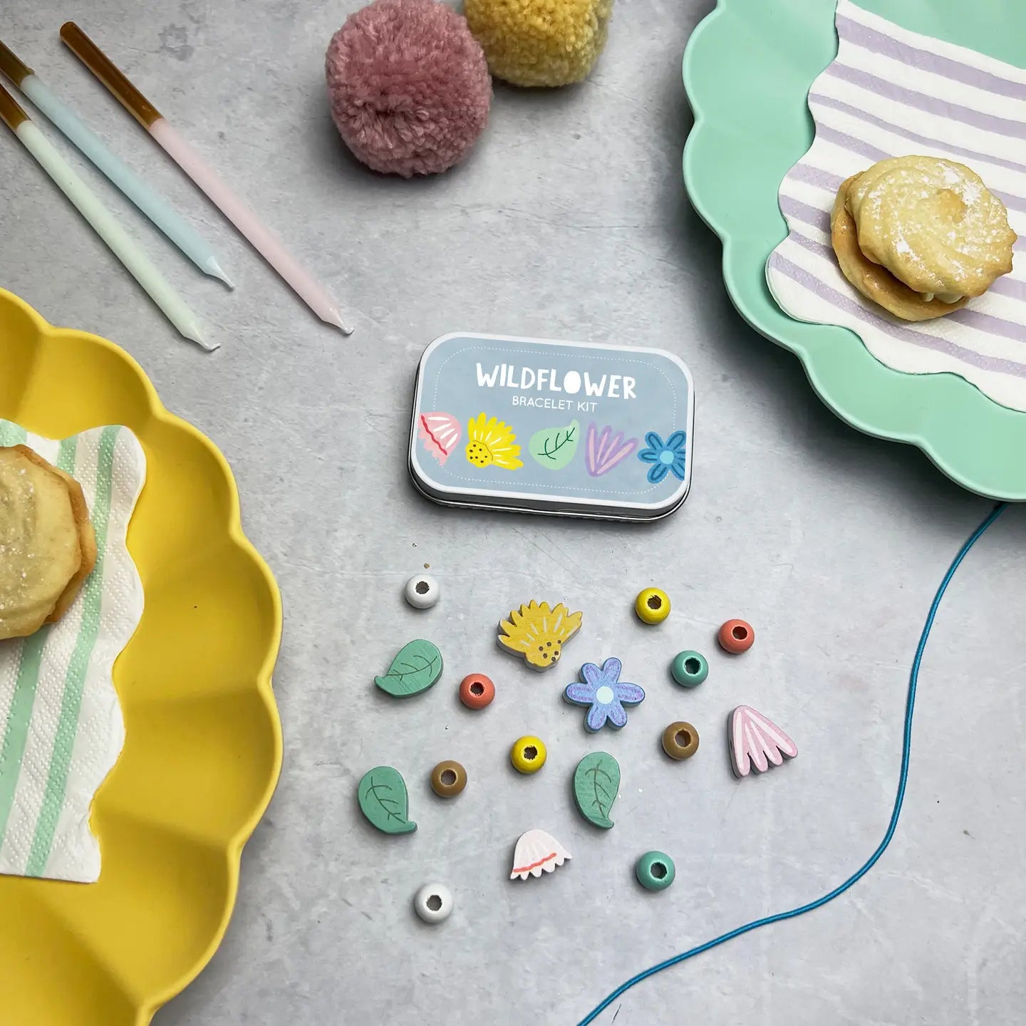 The charming gift tin contains elastic and beads to create a lovely wildflower bracelet featuring flowers, leaves and spherical wooden beads. The elastic comes with hard ends to aid the beading process for young children. Then a little patience and precision are all that's needed assemble the bracelet.