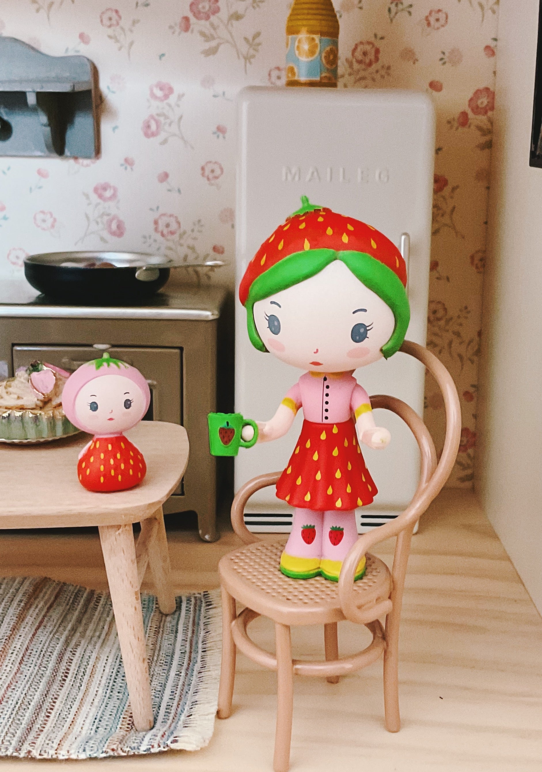 Always accompanied by her tiny strawberry friend Lila, and carrying her pretty carafe and glass, Berry is a sweet little figure with a love for all things strawberry. She belongs to the charming, poetic world of Tinyly – articulated figurines with delicate features and soft colours, perfect for display, collection, or for bringing magical stories and fabulous adventures to life.