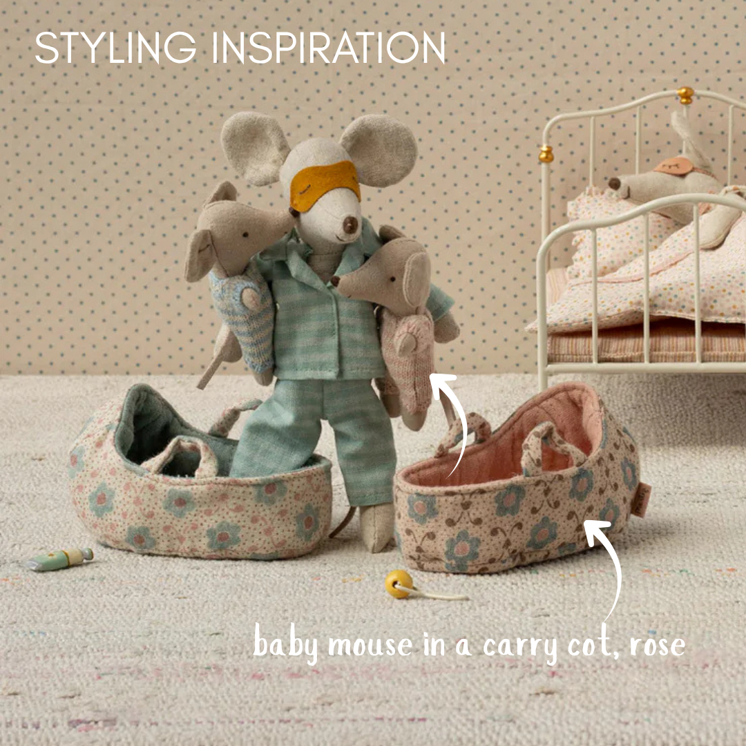 Alongside the furniture, this bundle includes an adorable Maileg baby mouse in a fabric carry cot. The bundle also includes all the essentials you'll need for the baby: a cosy carrycot for peaceful naps, a sweet little bouncer, as well as a high chair so that baby mouse can sit at the dining table.