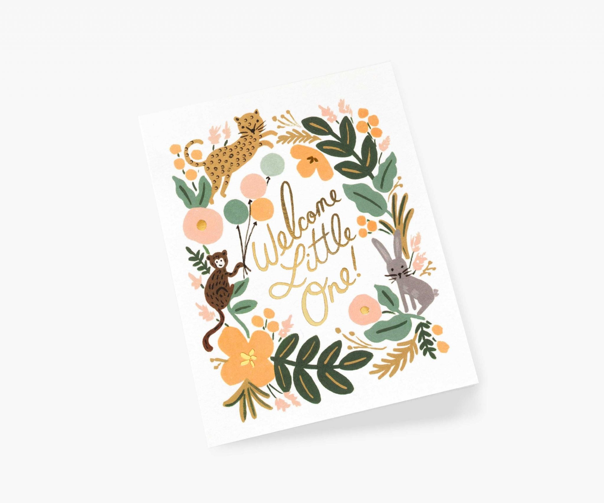 This beautiful new baby card from Rifle Paper Co features 'Welcome Little One' in gold lettering surrounded by a menagerie of animals. A blank interior lets your handwritten note take centre stage.